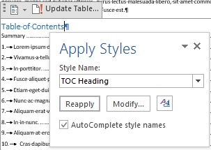 - Im some localisations of office, it is prepended with a “1.” and becomes “1. Table of Contents”. If it does, then you have to change style “TOC Heading” and undo the numbering as done with “Heading 1 – non-numbering” by pressing